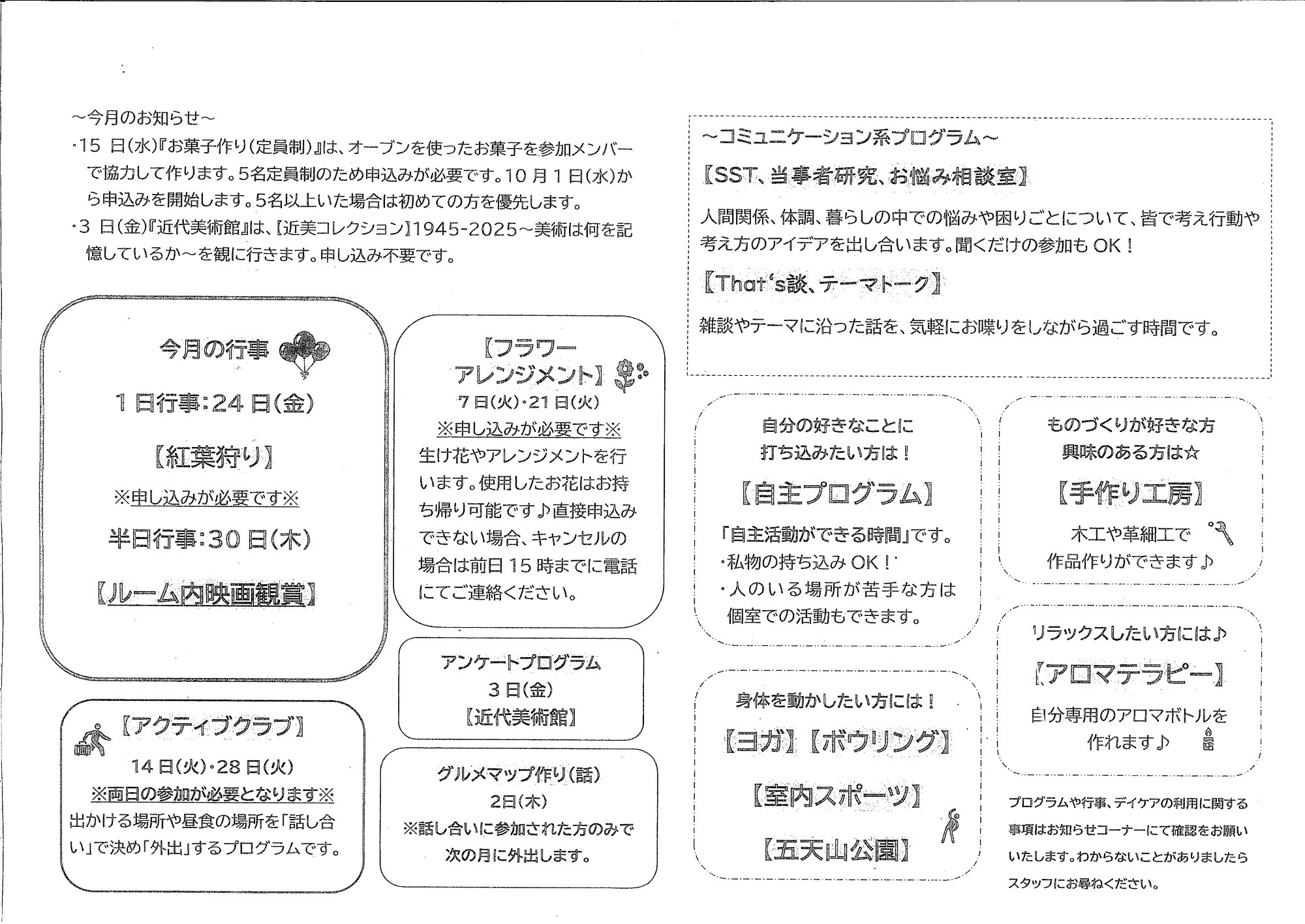 11月のデイケアは、外出プログラムとして28日(金)に「マリンパークニクス見学」を予定しています。また13日(木)に「雪印パーラーに行こう」を予定しています。ほかにもヨガやアロマテラピーなど趣味を広げたり、リラクゼーションができるもの、SST(社会生活スキルトレーニング)やお悩み相談室、That’s談、テーマトークなどコミュニケーションをとったり、学ぶことができるものもあります。詳しくは院内のお知らせや、デイケアまでお尋ねください。