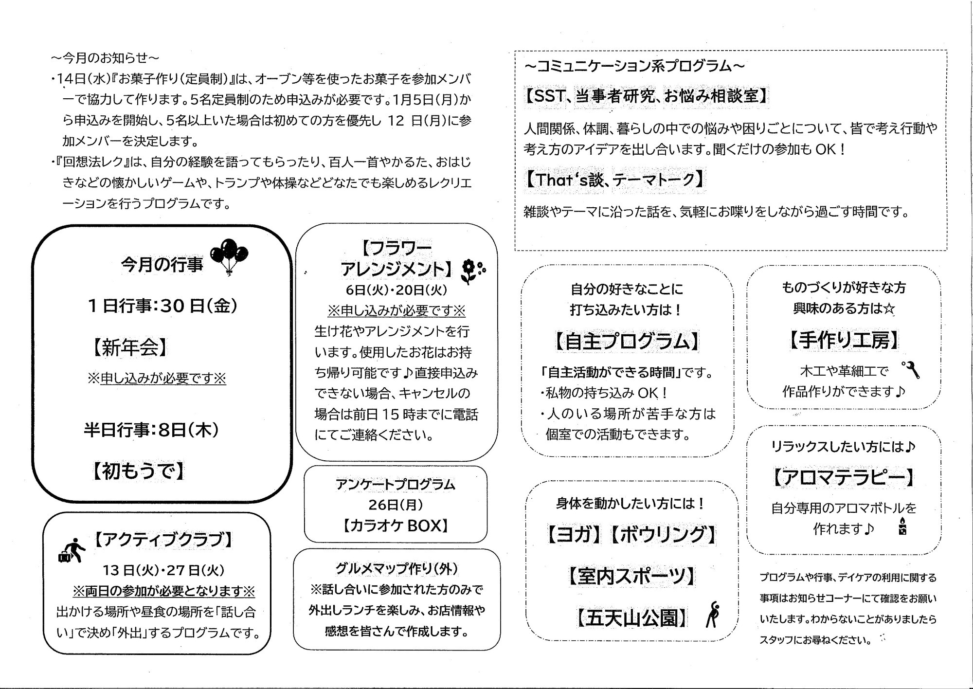1月のデイケアは、一日行事として30日(金)に「新年会」を予定しています。また8日(木)に「初もうで」を予定しています。ほかにもヨガやアロマテラピーなど趣味を広げたり、リラクゼーションができるもの、SST(社会生活スキルトレーニング)やお悩み相談室、That’s談、テーマトークなどコミュニケーションをとったり、学ぶことができるものもあります。詳しくは院内のお知らせや、デイケアまでお尋ねください。