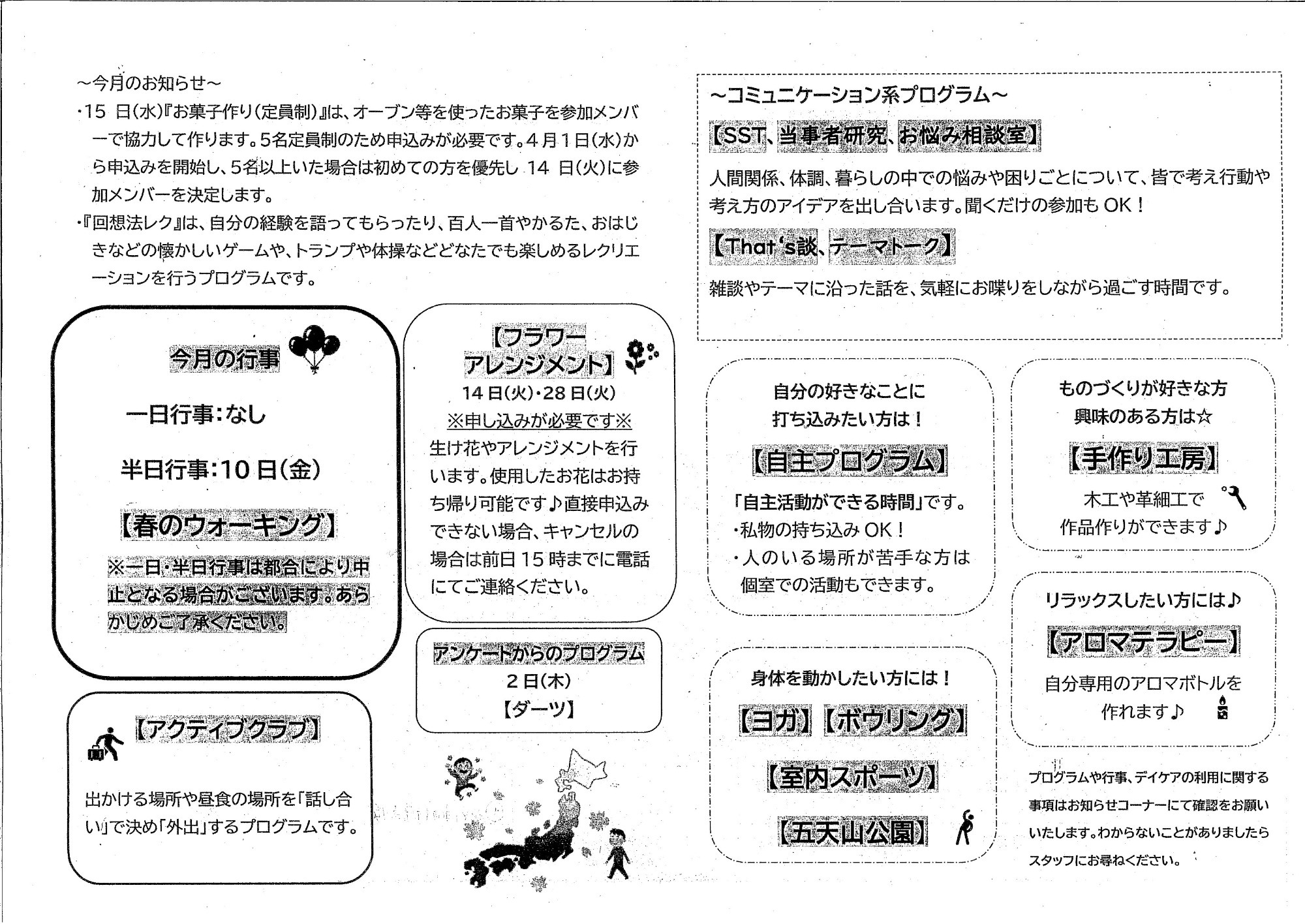 4月のデイケアは、行事として10日(金)に「春のウォーキング」を予定しています。ほかにもヨガやアロマテラピーなど趣味を広げたり、リラクゼーションができるもの、SST(社会生活スキルトレーニング)やお悩み相談室、That’s談、テーマトークなどコミュニケーションをとったり、学ぶことができるものもあります。詳しくは院内のお知らせや、デイケアまでお尋ねください。